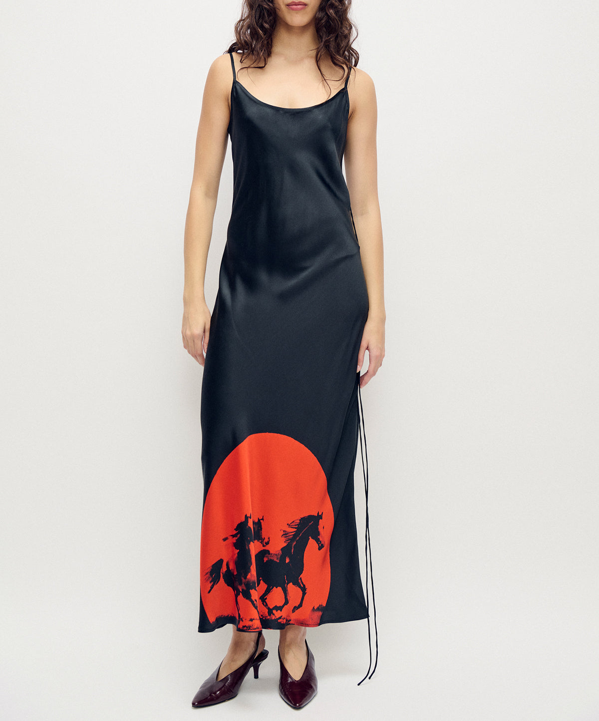 Crafted from pure silk, it’s cut on the bias to contour the body with effortless drape and fluidity. The minimalist silhouette is elevated by a bold red sun motif featuring galloping horses, an emblem of strength and renewal, set against a deep black base.