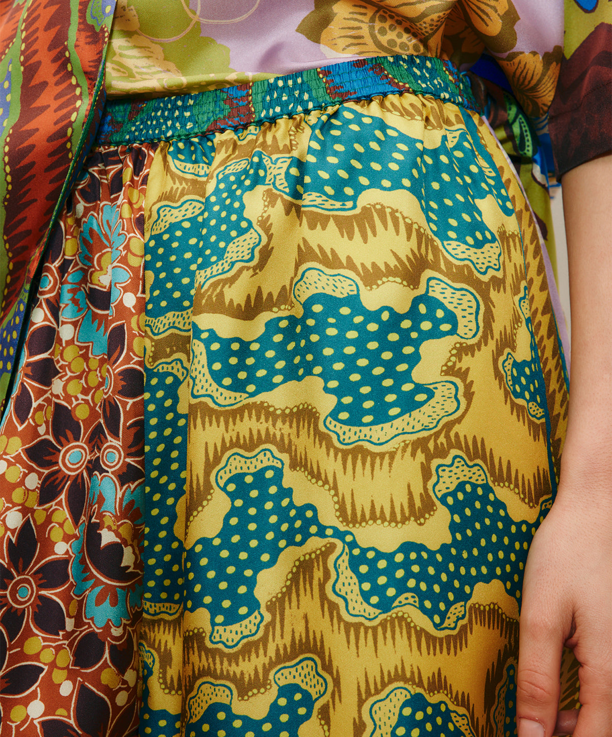 Cut from pure silk twill, these relaxed shorts feature a vibrant patchwork print blending heritage florals, abstract motifs and painterly waves in saturated hues of teal, ochre, and terracotta.