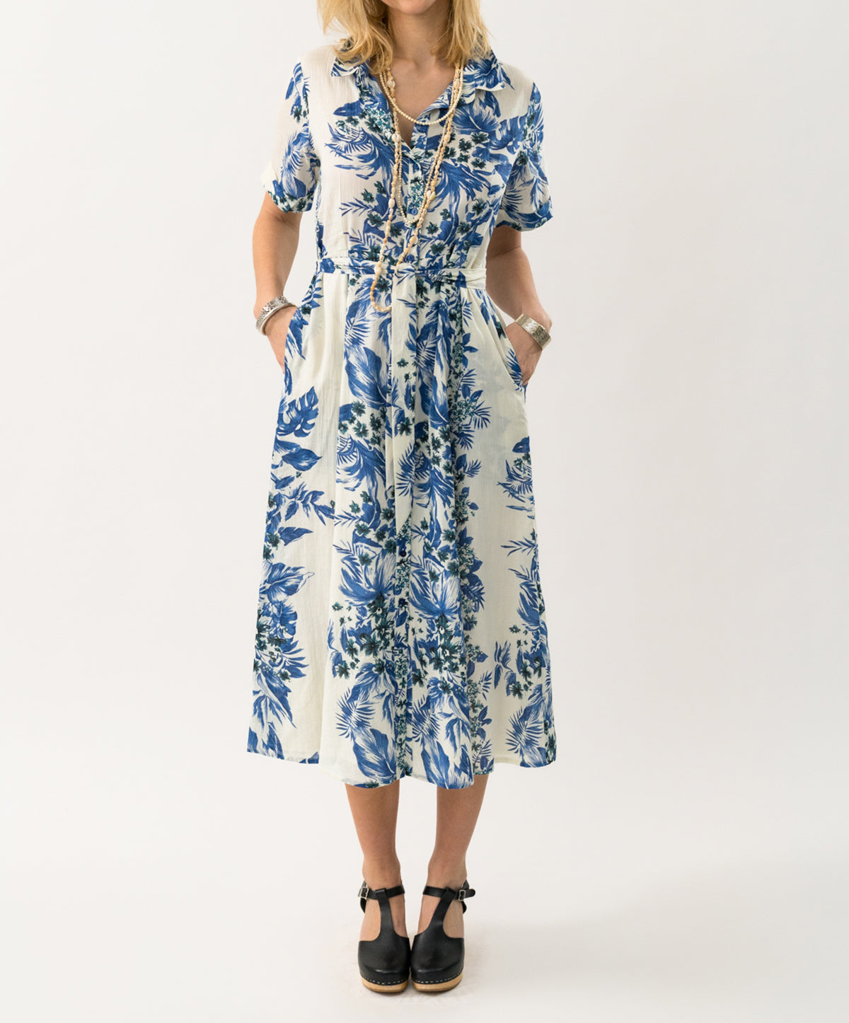 Crafted from lightweight cotton voile, this full-length silhouette features a classic shirt-dress construction elevated by a vivid botanical print in hand-painted porcelain-inspired blues and soft leafy greens.