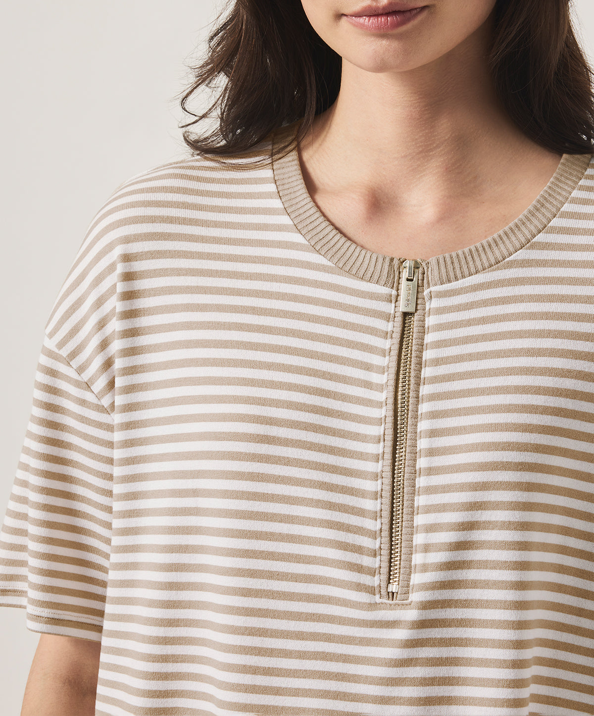Splendid’s Brooke Short Sleeve Stripe Top is knitted from stretch jersey with slim beige stripes that nicely compliment the ivory backdrop.