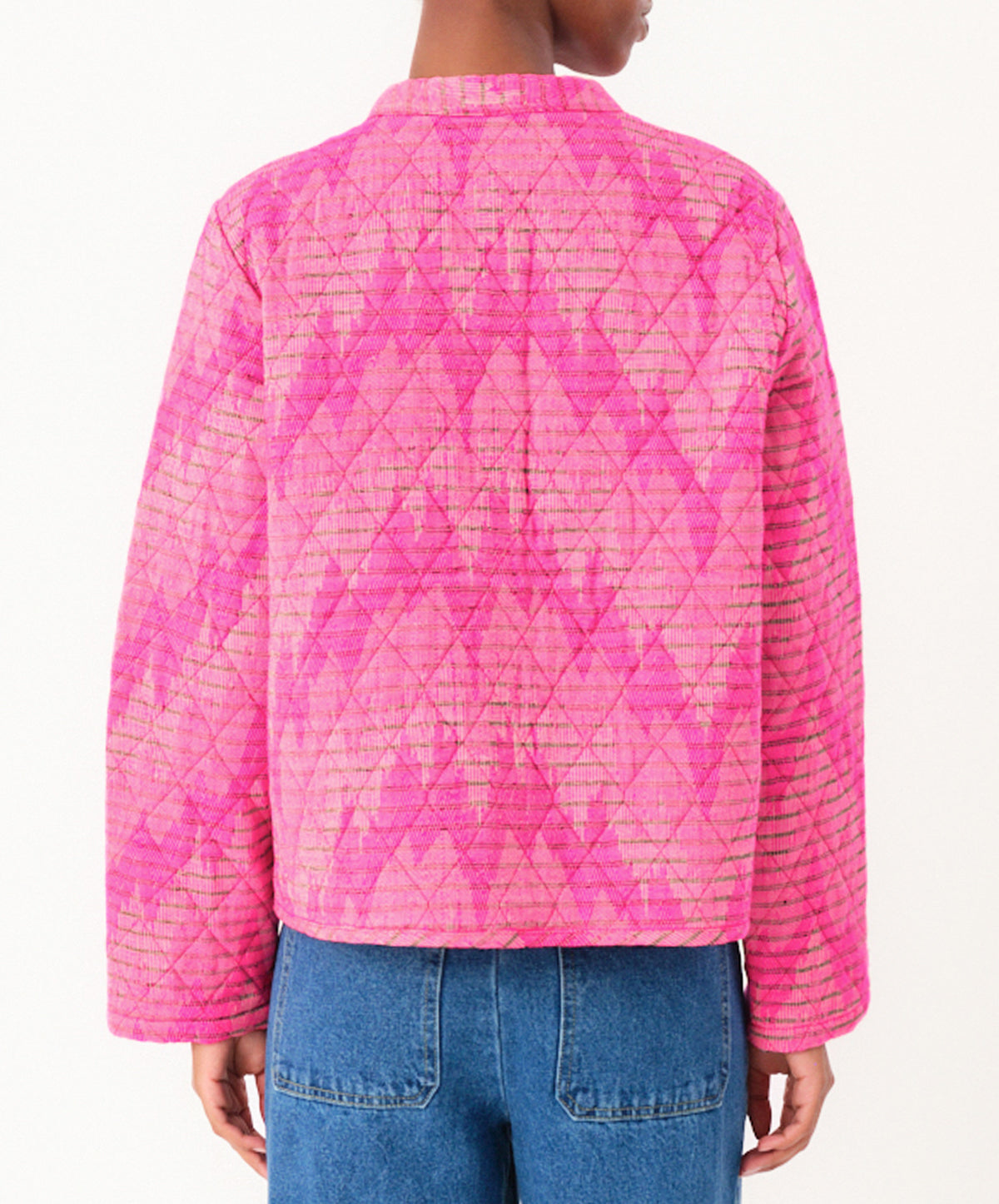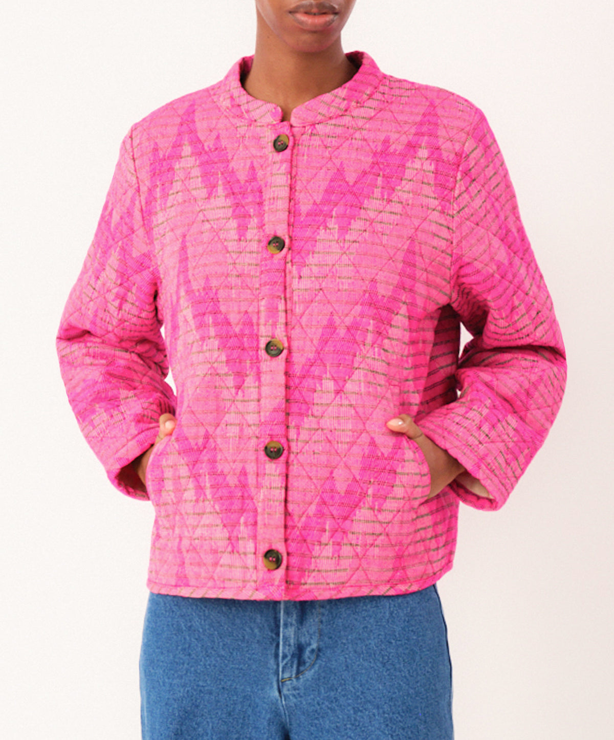 Cut from a textured cotton-blend, it’s quilted for a softly padded handle and patterned with tonal pink, lightning-bolt chevrons that feel distinctly playful. The collarless neckline and straight, slightly boxy silhouette keep it modern, while tortoiseshell buttons and discreet side pockets add polish and practicality.