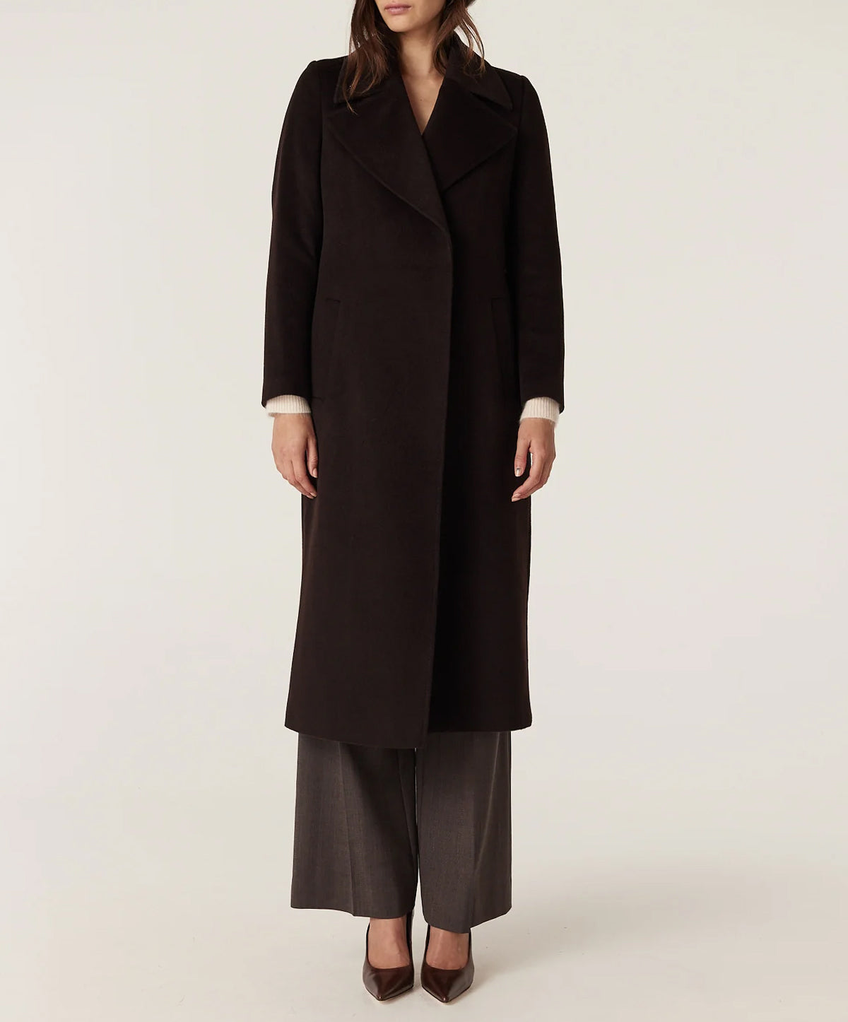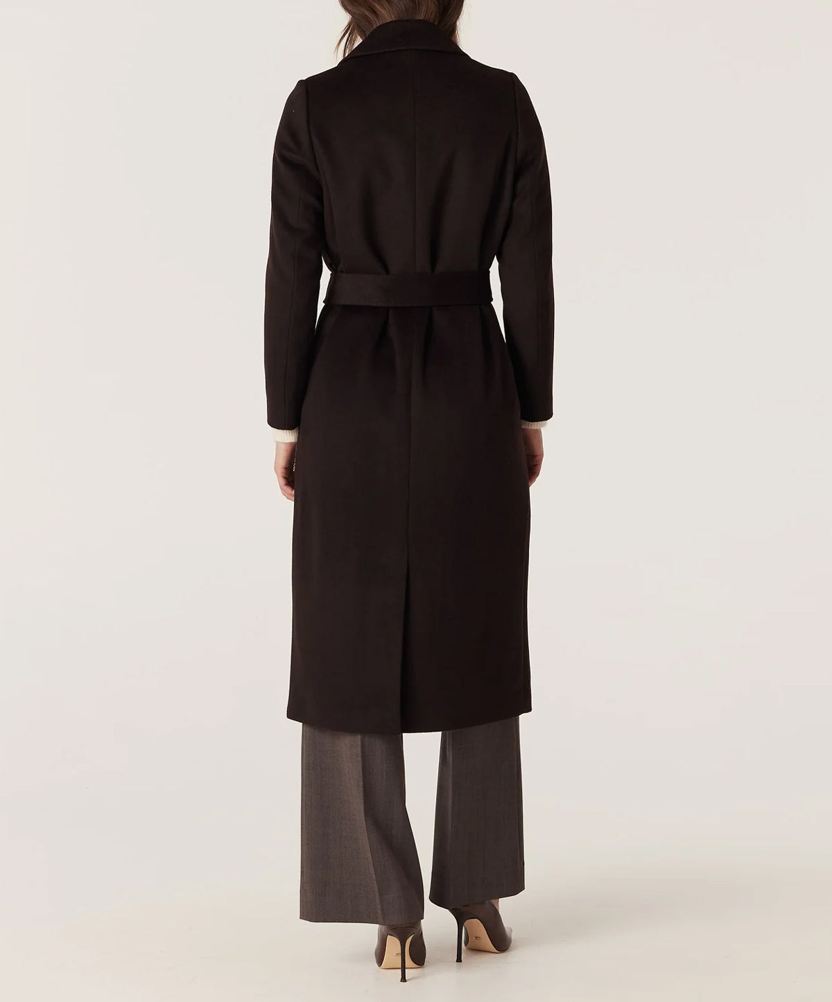 The longline wrap silhouette features exaggerated notched lapels, a clean, buttonless front and a self-tie belt that cinches the waist to create subtle definition over knitwear or suiting. Cut to fall below the knee, it offers refined coverage without feeling bulky, while discreet welt pockets keep the lines sleek.