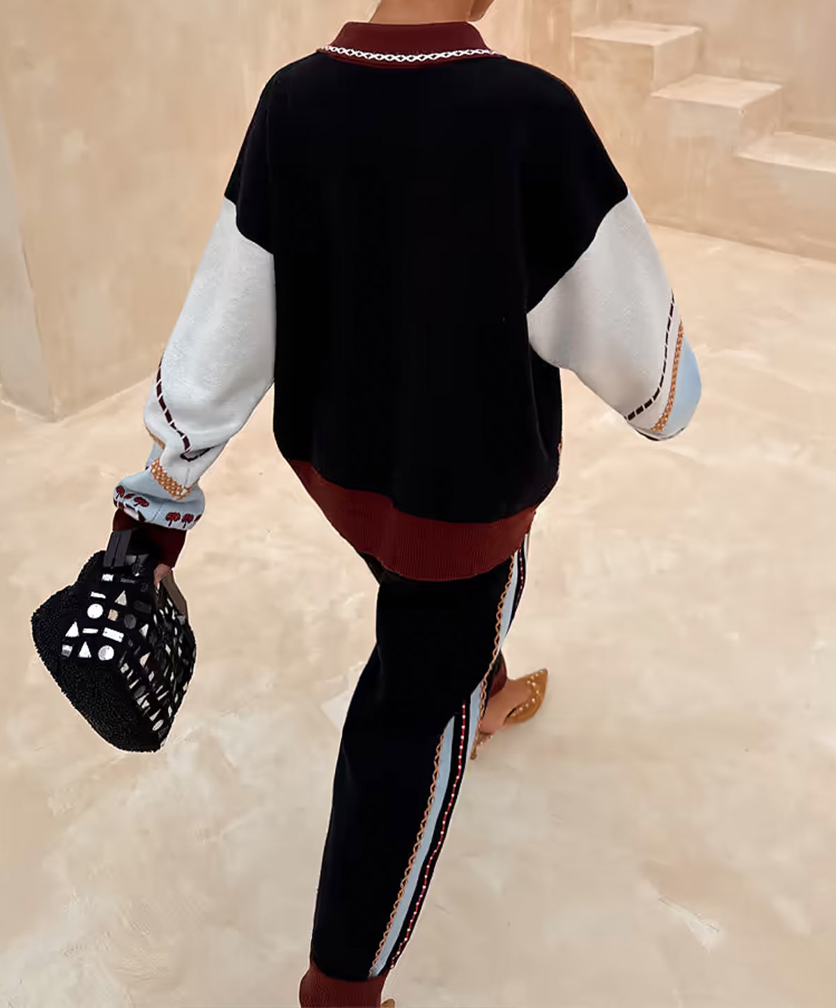 Never Fully Dressed’s Geometric Knit Cardigan with Embroidery Detail brings a bold, artisanal spirit to classic knitw...