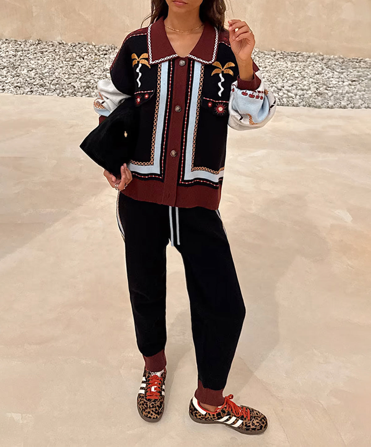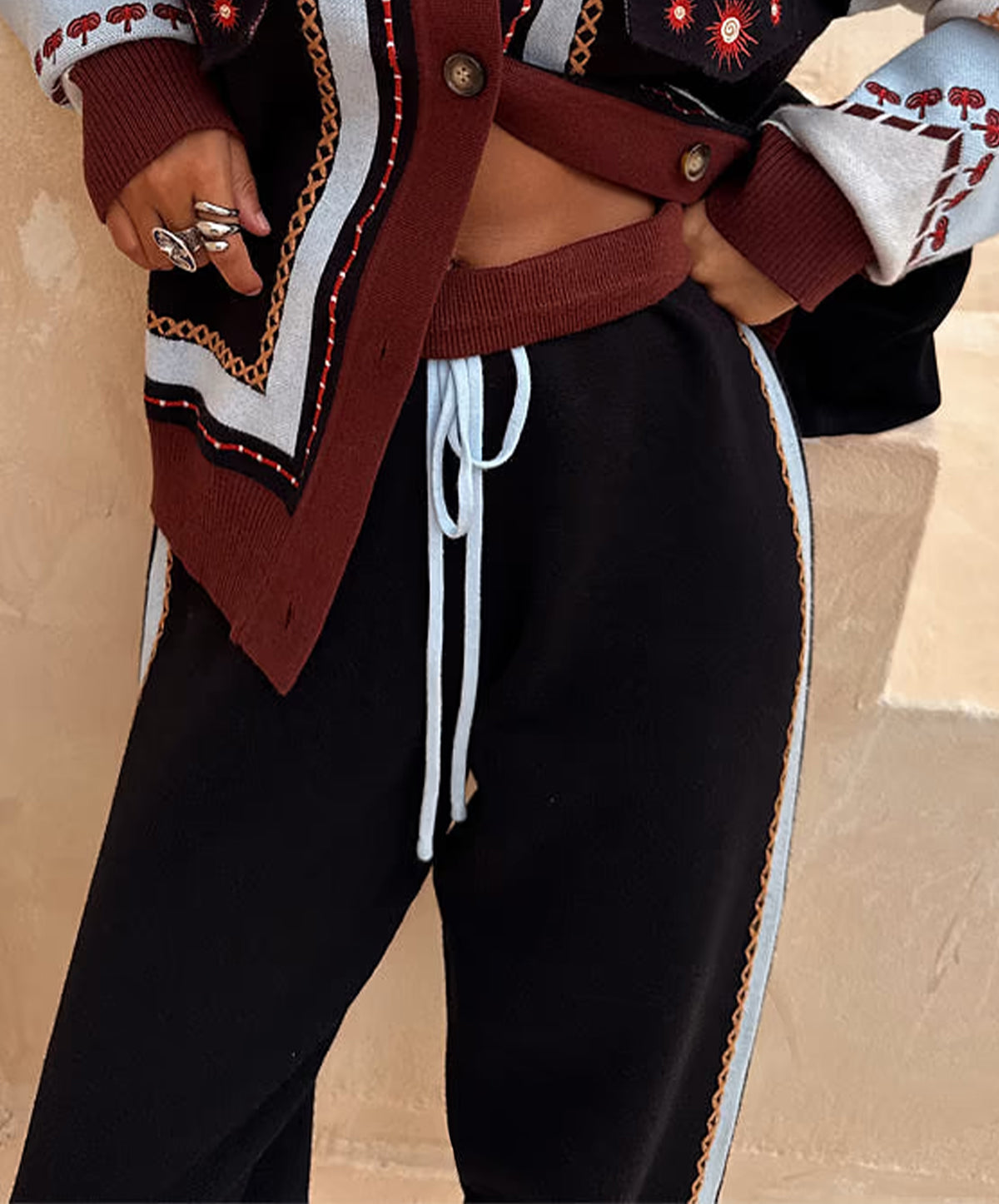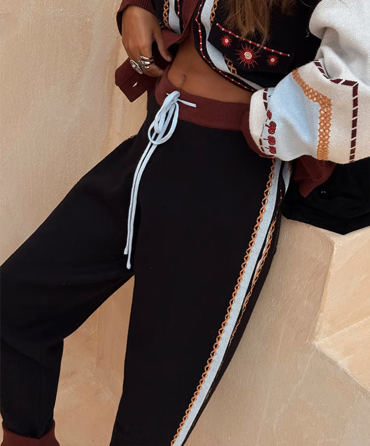 Never Fully Dressed’s Geometric Knit Jogger is the perfect balance of comfort and style, bringing a fashion-forward twist to everyday loungewear. Knitted from a soft mid-weight yarn, these statement joggers are patterned with bold burgundy, cream, and navy geometric motifs, creating a playful yet polished aesthetic. Subtle embroidered details elevate the design, giving this embroidered jogger set a textural finish that feels contemporary and artisanal.
