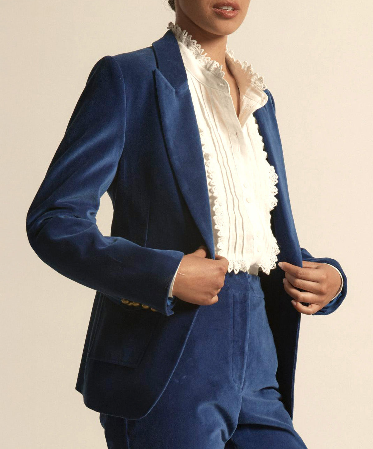 Impeccably tailored in sumptuous sapphire-blue velvet, the Glace Jacket evokes timeless sophistication with a modern, feminine edge.