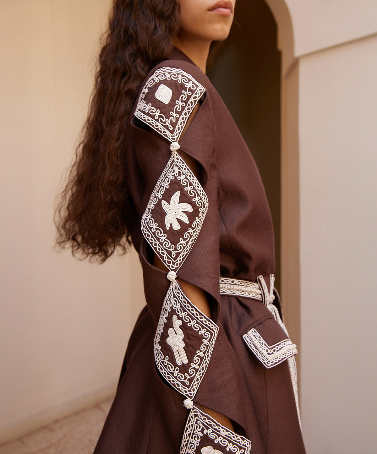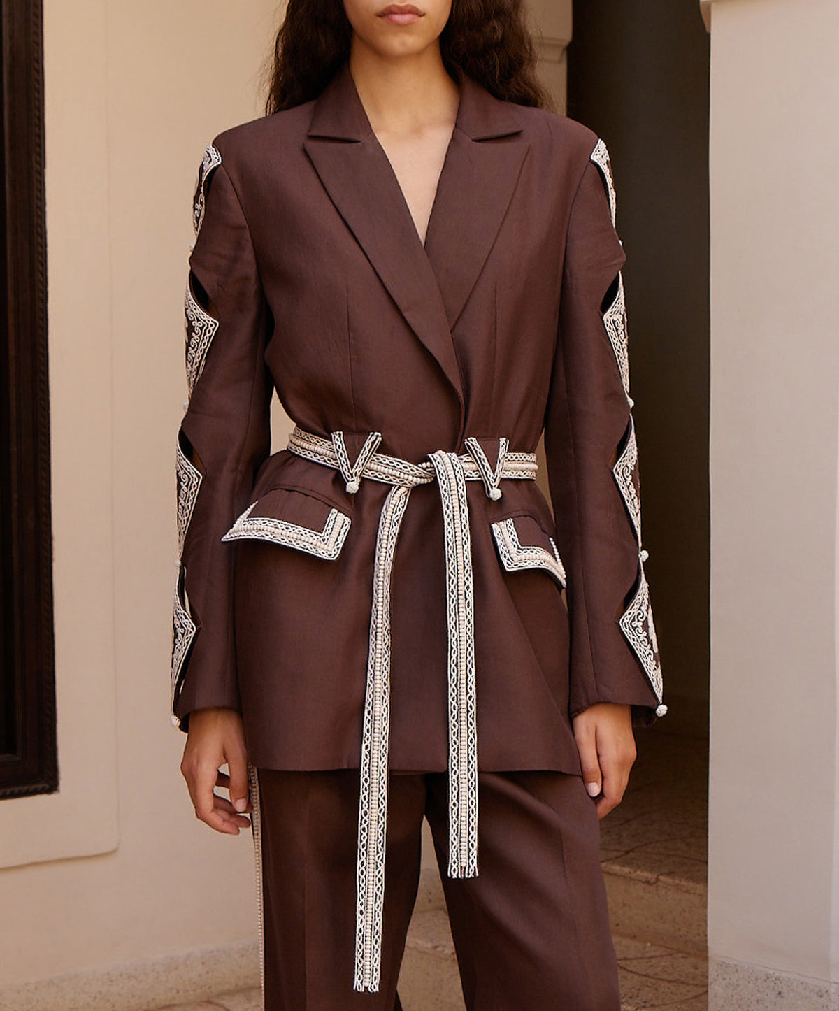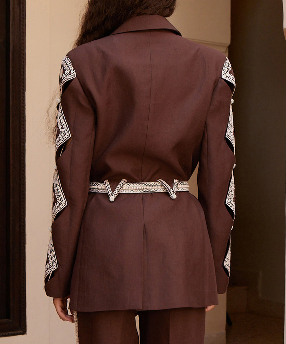 Tailored from fluid, weighty silk-linen in a rich chocolate hue, this structured silhouette is reimagined through cut-out sleeves, linked with tonal corded knots and embroidered diamond appliqués inspired by traditional motifs. A contrast rope belt and intricately framed flap pockets complete the look, evoking a sense of relaxed elegance grounded in texture and form.