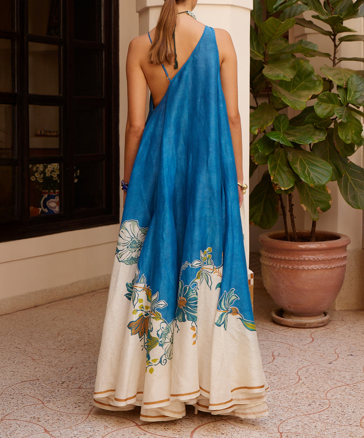 Cut from lightweight ramie with a beautiful natural drape, this voluminous silhouette falls effortlessly from fine rouleau straps, opening to a generous, sweeping hemline. A cascade of floral illustrations unfurls across the gown’s contrast border, hand-drawn by the label’s in-house team in a tribute to both heritage and artistic flair.