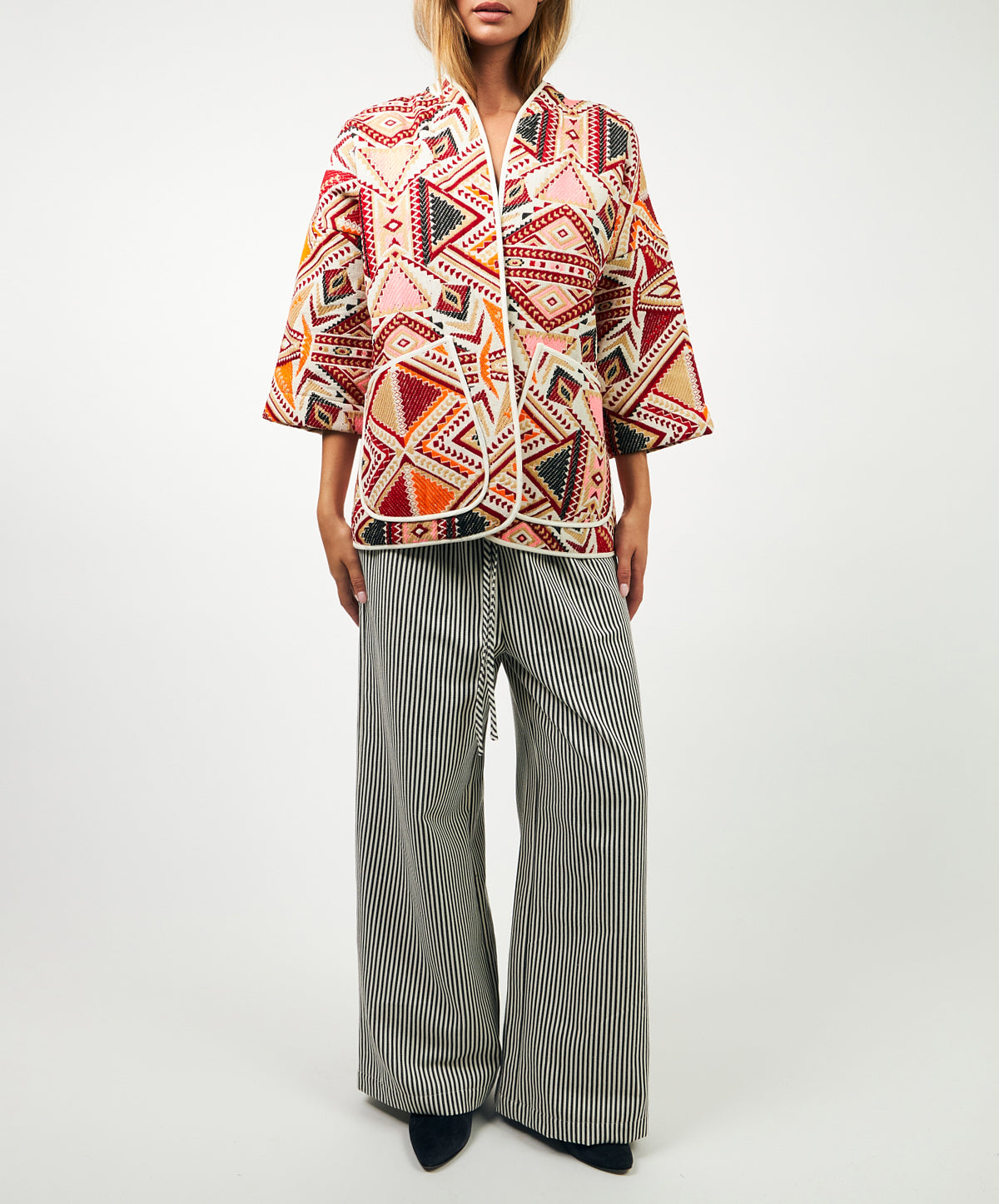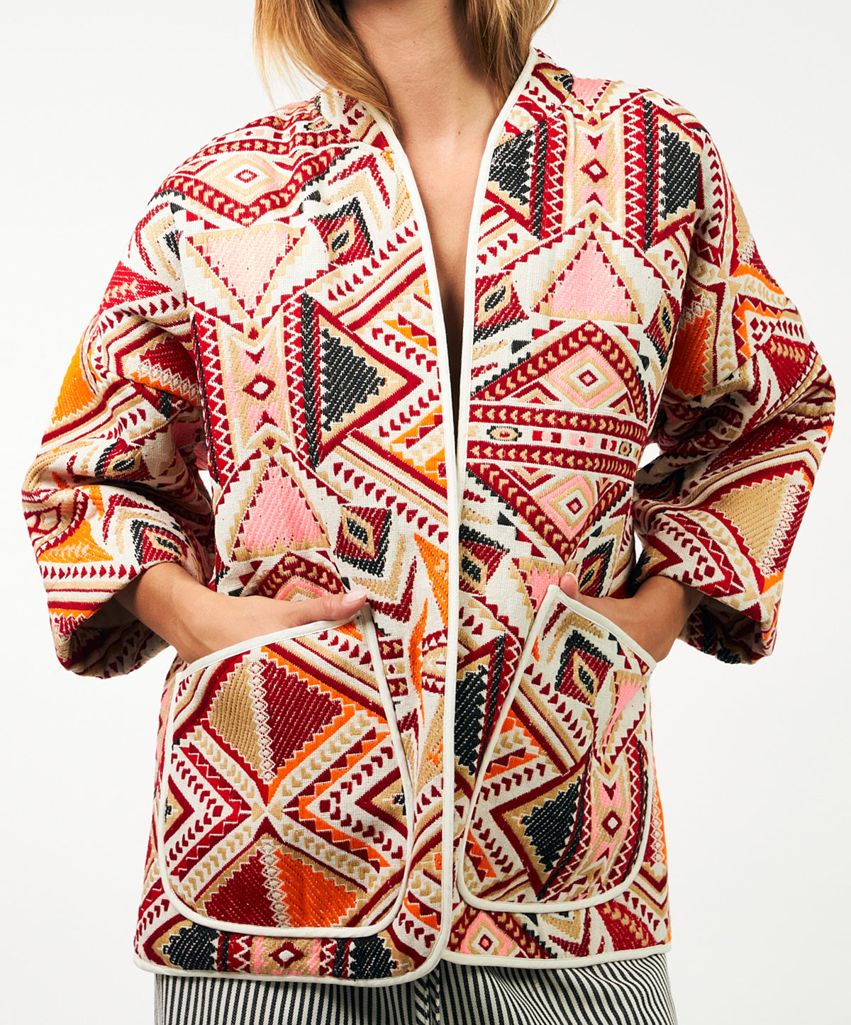 Cut from a cotton-blend jacquard, its tactile weave showcases an intricate geometric red print that radiates warmth and confidence in equal measure. Designed with wide kimono sleeves and a relaxed, open silhouette, it moves with a sense of ease–the kind of effortless structure that defines Scandinavian dressing.