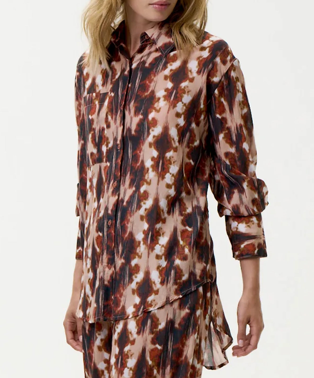 Crafted from lightweight ‘sushi voile’, it’s cut to a relaxed silhouette with dropped shoulders, a curved hem and a fluid drape that skims the frame. The painterly, earth-toned abstract print evokes sunsets over Mediterranean stone, while the single chest pocket and button front add utilitarian structure.