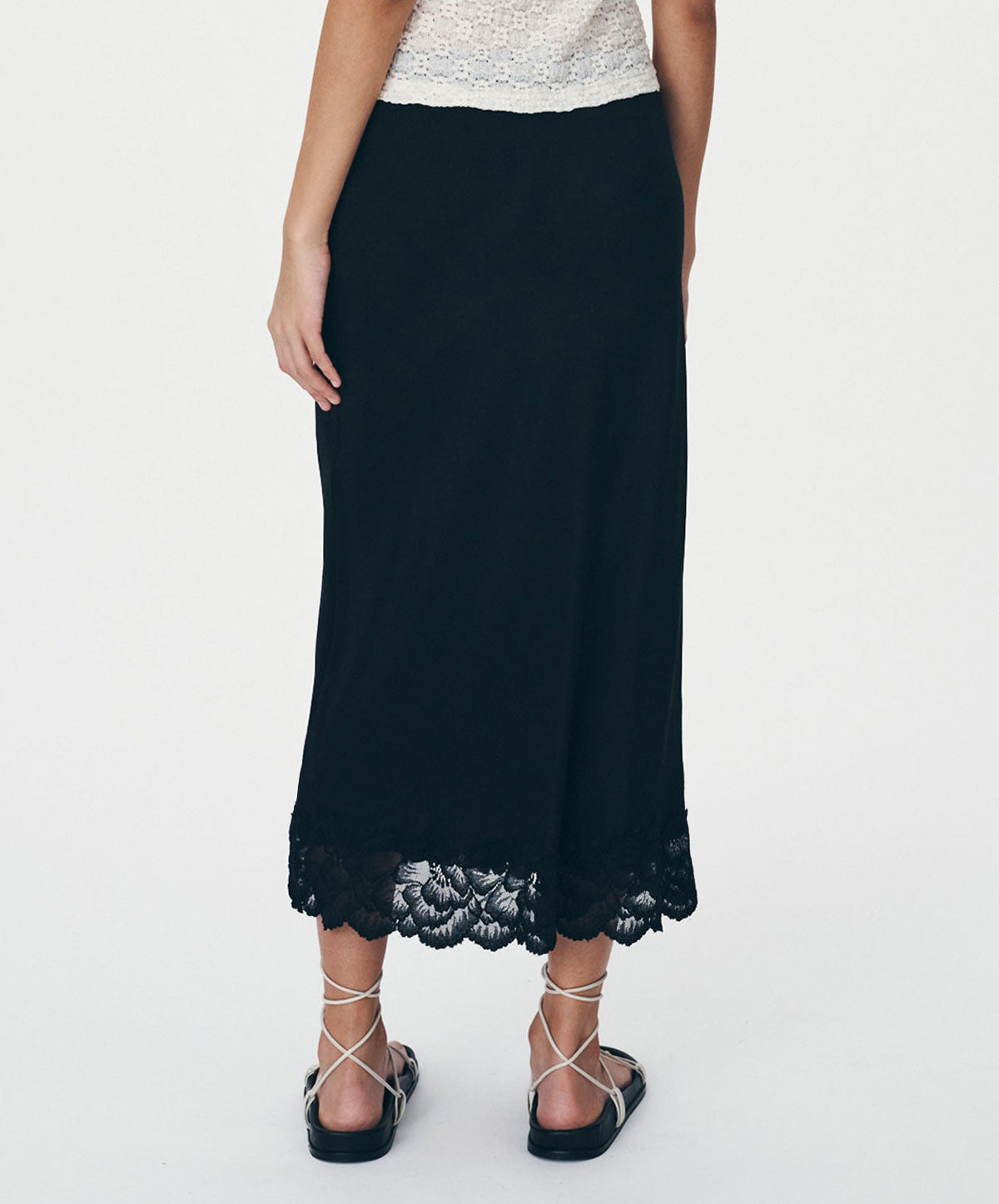 The skirt is finished with delicate floral lace trim along the hem, adding a touch of romance and artisanal detail to its minimalist shape. An elasticated waistband ensures a comfortable fit, while the clean, slip-on design makes it an easy choice for everyday wear or elevated evening styling.