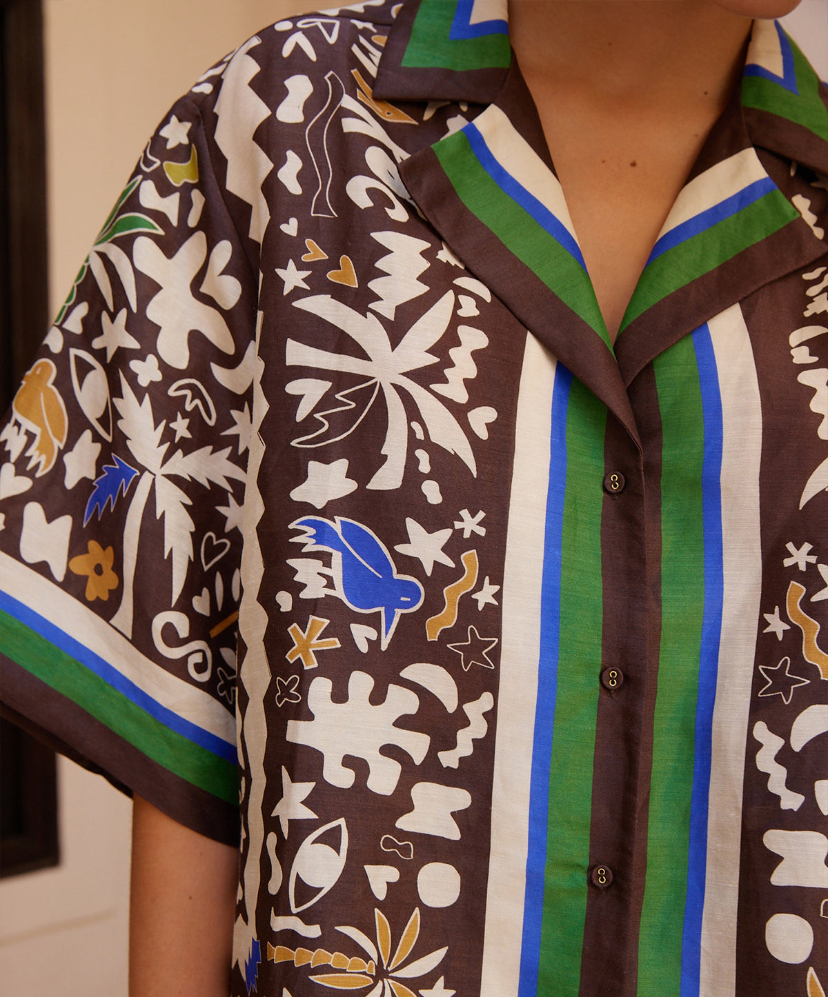 Cut from airy ramie, this women’s short-sleeved shirt features an expressive, folkloric motif print–in collaboration with Moroccan artist collective LRNCE–rendered in earthy tones of cocoa, ochre, cobalt and grass green.