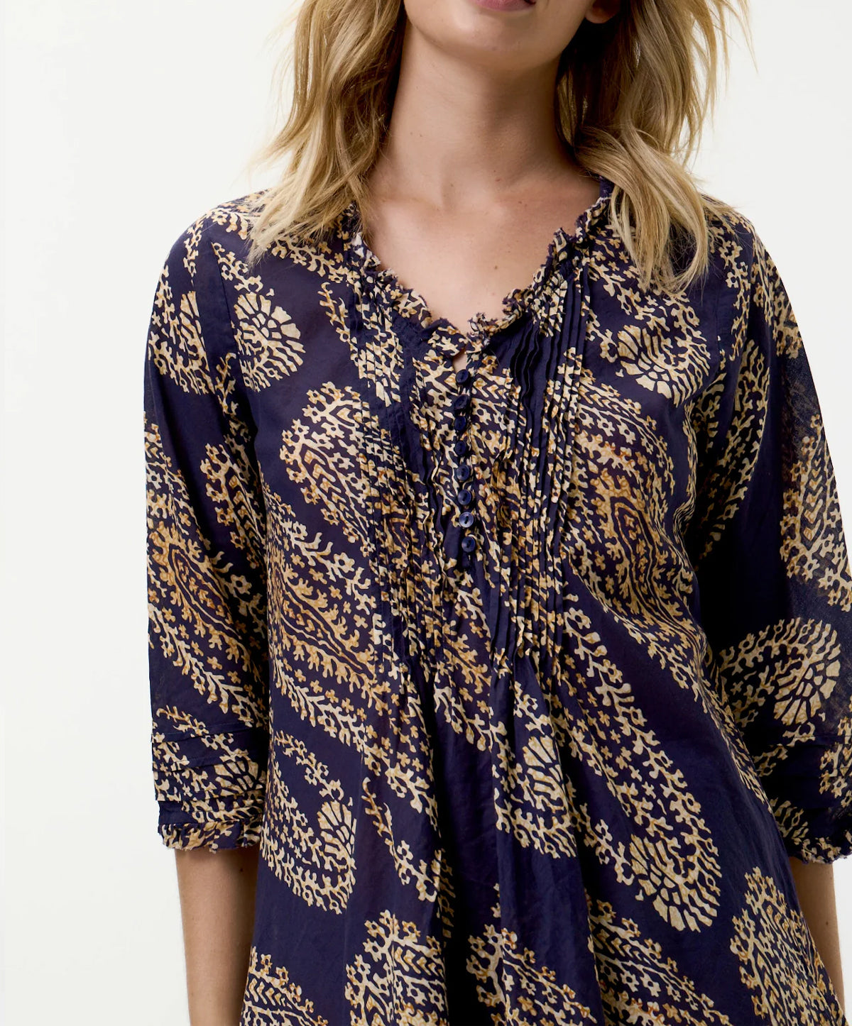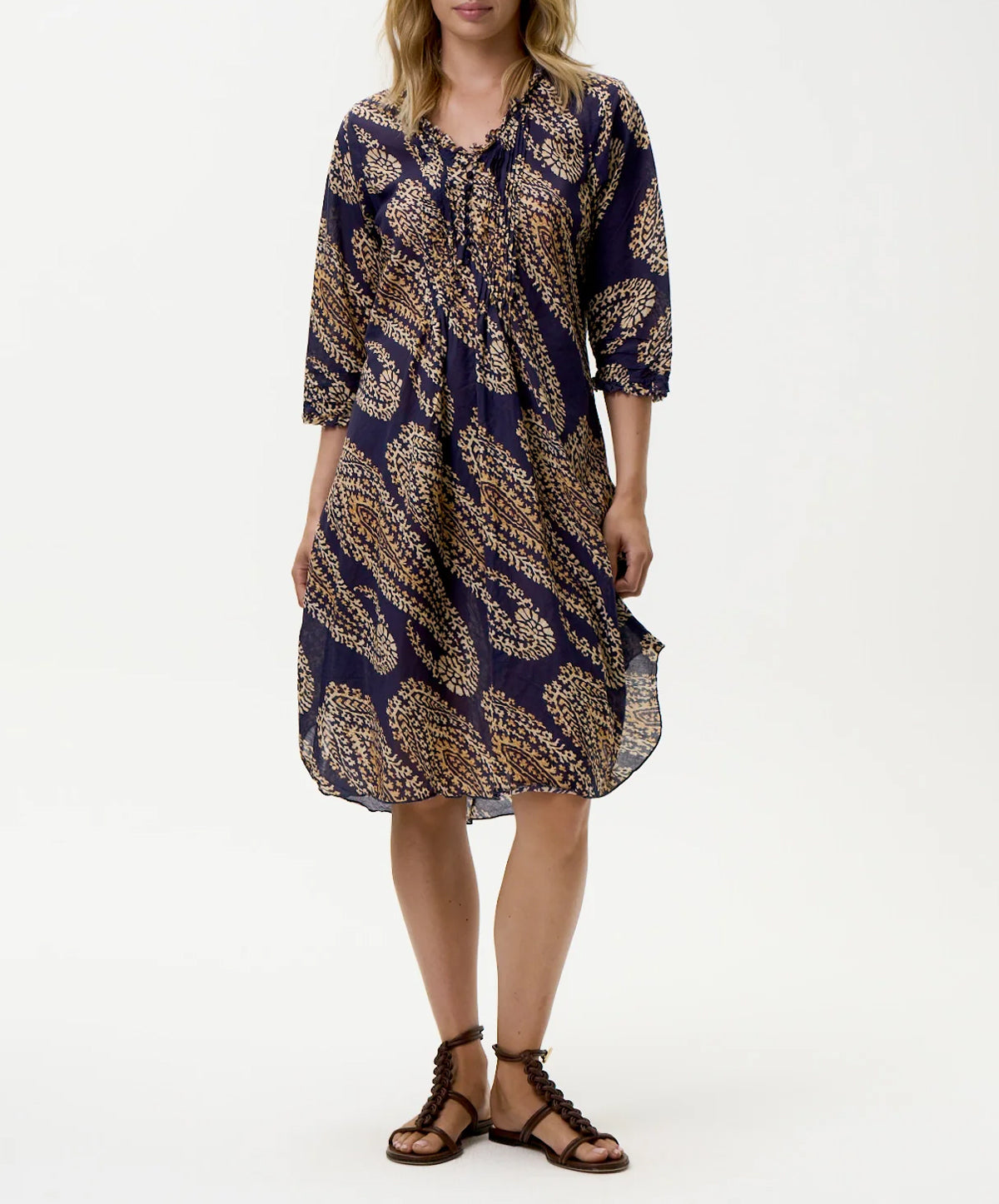 Cut from featherweight cotton in a rich navy base, it’s artfully adorned with swirling gold paisley motifs that speak to the brand’s bohemian spirit. The signature pintucked bodice and short button placket lend artisanal texture, while the soft A-line silhouette and ¾-length sleeves make it perfect for transitioning from beach to bistro.