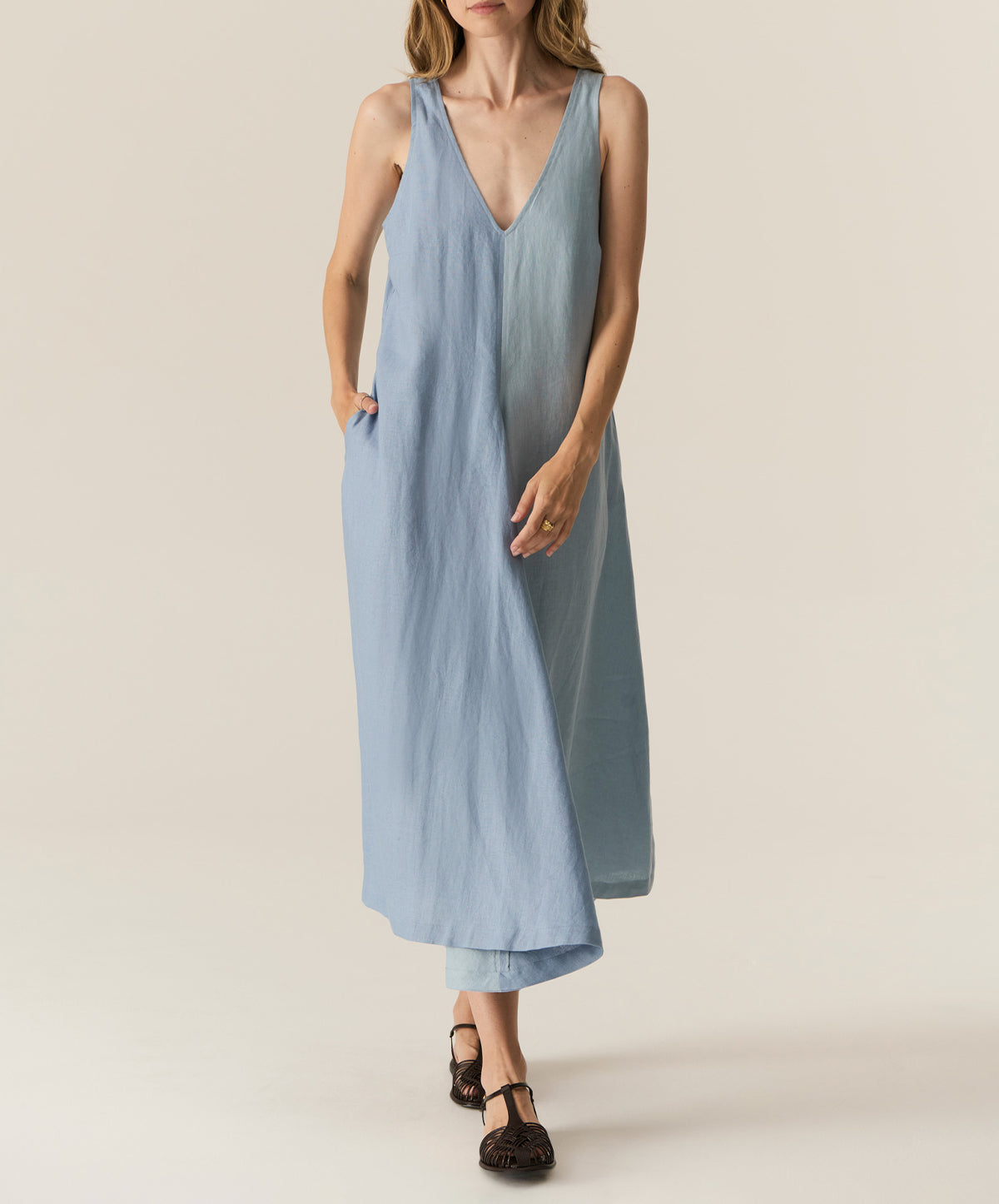 Made from 100% linen in a two-tone palette of sun-faded blues, this midi-length design plays on asymmetry with its split-panel construction. A plunging V-neckline and sleeveless silhouette bring a fresh lightness, while the bias-cut drape ensures beautiful movement with every step.