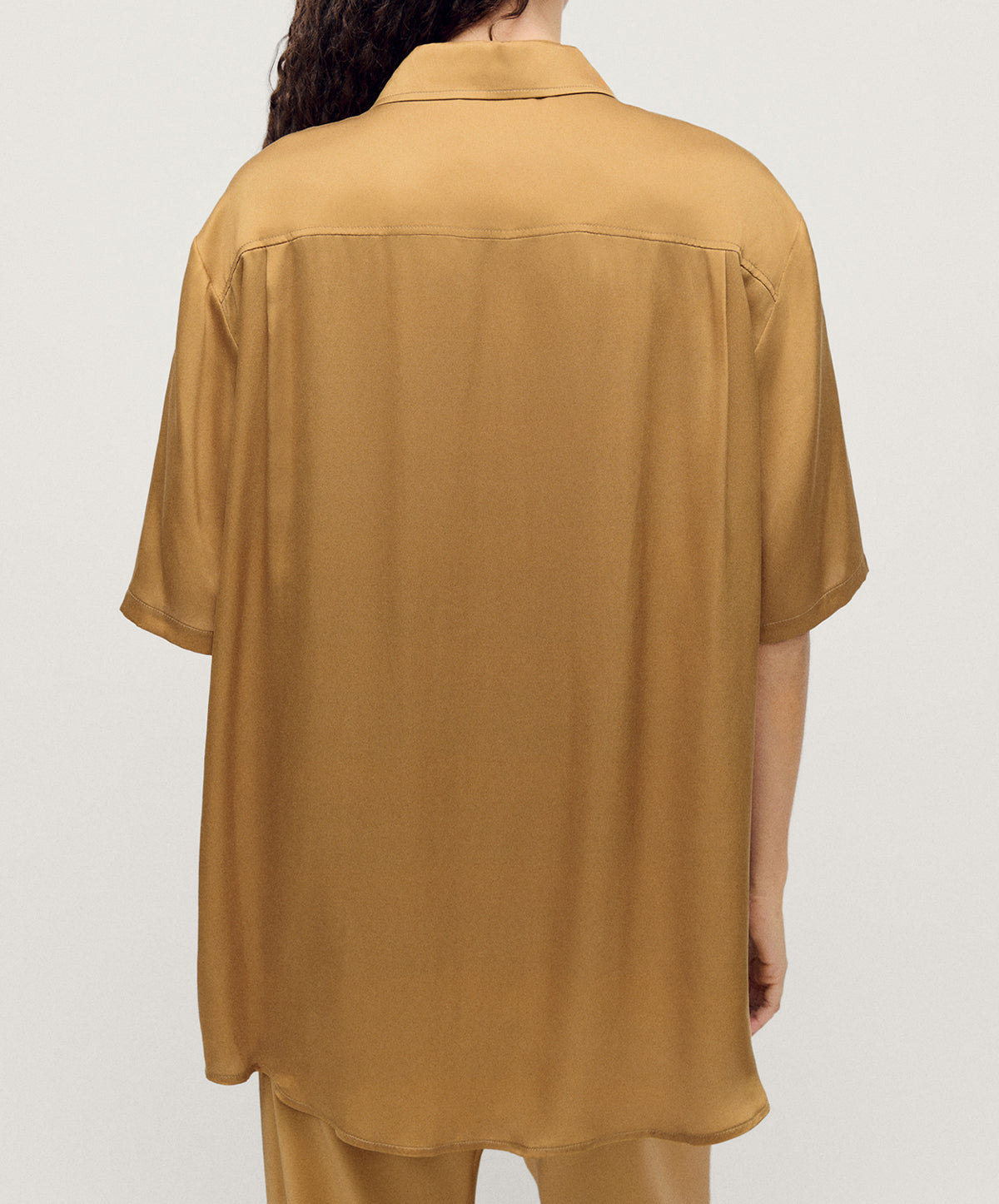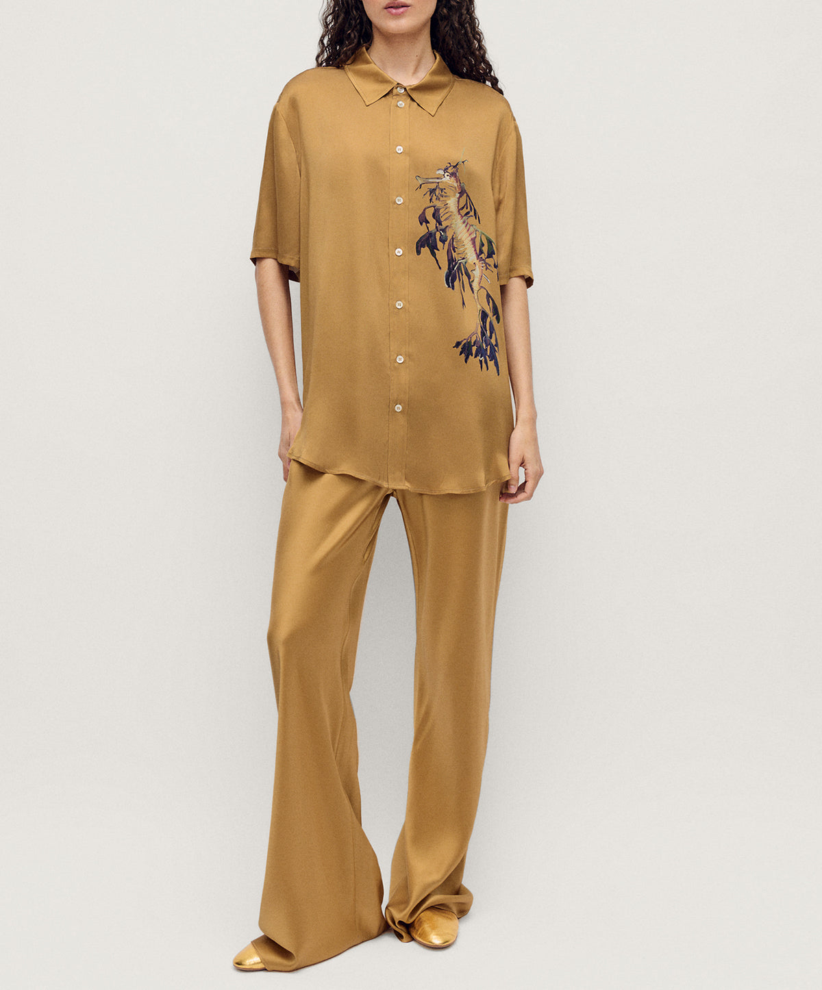 It’s cut from airy silk that’s been lightly sand-washed for a tactile finish and has a classic collar and a full-front button placket. It’s been shaped for a loose, borrowed-from-the-boys fit and drapes to a curved hem below the hip.