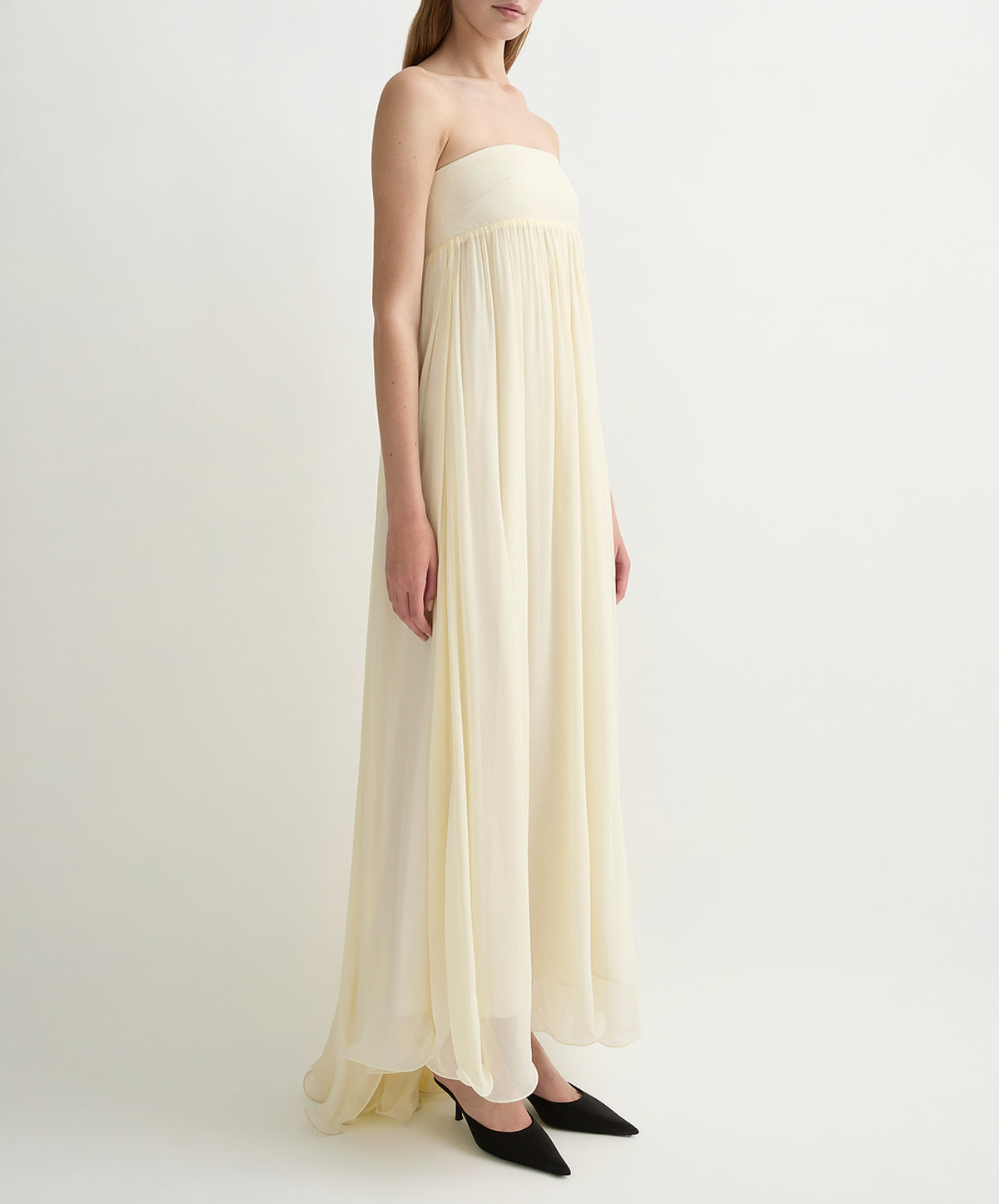 Cut from fluid chiffon, this strapless maxi dress drapes beautifully over the body, creating an effortless silhouette that moves with ease. The structured satin bodice is finished with a hint of stretch to provide subtle support and shape, balancing the weightless flow of the skirt.