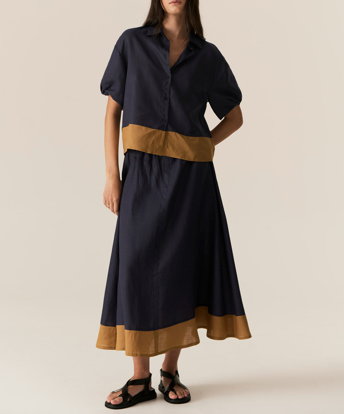 Cut from airy ramie–prized for its breathable, breezy, linen-like finish–this button-down style is rendered in rich contrasting tones for a directional yet easy-going mood. The relaxed silhouette is defined by softly dropped shoulders, voluminous short sleeves, and a wide hem panel that elevates its simplicity with subtle polish.