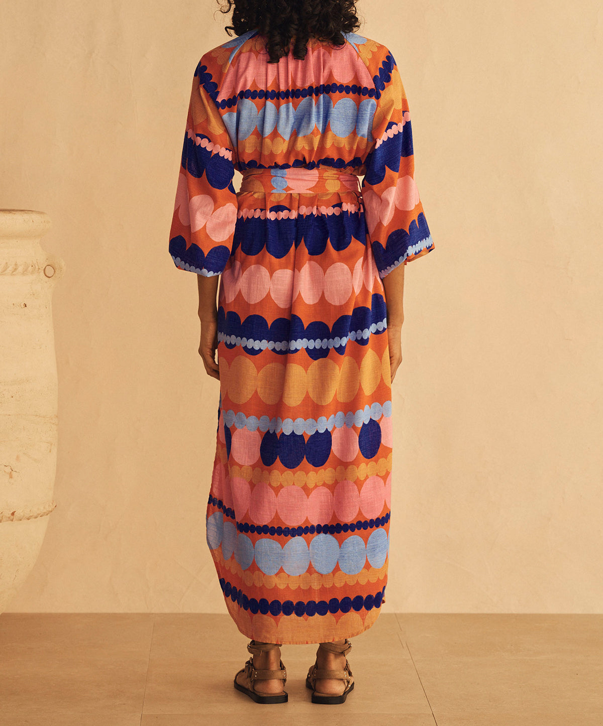 Made from breathable cotton voile, it’s patterned with scalloped waves and graphic dots in warm citrus tones, grounded by vibrant marine blue. The voluminous sleeves and softly cinched waist balance ease with structure, while the detachable belt with a fabric-covered buckle lends polish.