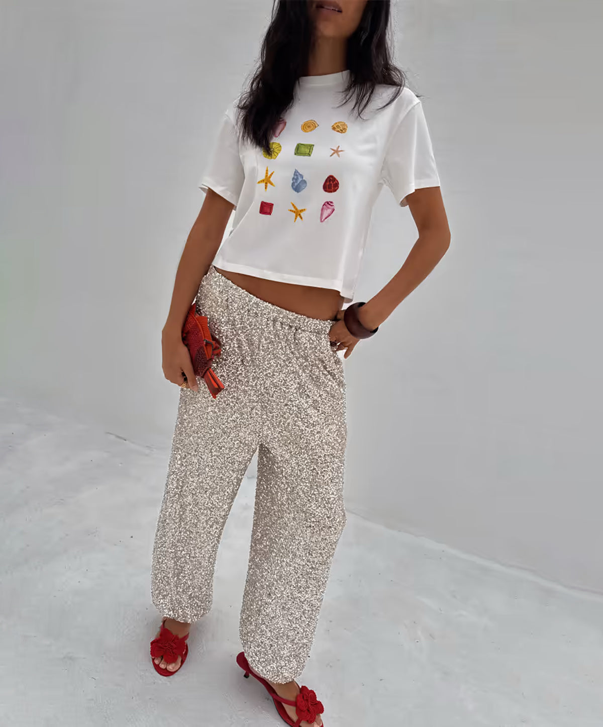 The Forme’s curated edit of Never Fully Dressed ranges from classic women’s button-ups and graphic t-shirts to luxurious velvet blazers. Highlights across the edit include the quintessential ‘Jaspre’ wrap skirt in shimmering silver sequin, fine gold plissé, and stunning black vegan leather.
