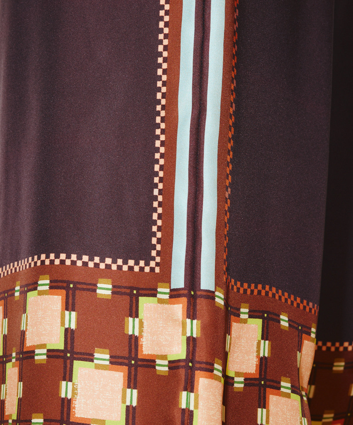 Cut from lustrous 100% silk twill, these fluid wide-leg trousers showcase the label’s distinctive patchwork-inspired print placement, blending earthy chocolate tones with pops of saffron, ivory, and pale blue.